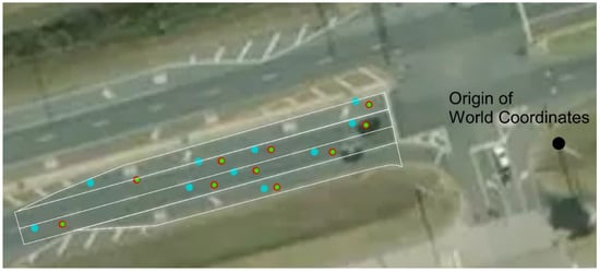 In this way, the intrinsic matrix , rotation matrix , and translation matrix can all be obtained. The translation matrix, , represents the distance between the new coordinate origin and the traffic pole. Each camera has its own associated transformation matrix, which does not change as long as the camera’s view angles are fixed. Therefore, camera calibration needs to be performed only once for each camera.