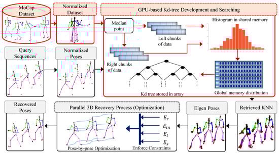 Our proposed framework is subdivided into two major modules. The first module is all about the preprocessing that involves the process of the normalization as well as GPU-based kd-tree development. The second module is purely relevant to searching and retrieving nearest neighbors and recovering 3D MoCap data with missing joints or markers. We discuss our proposed framework stepwise as follows.