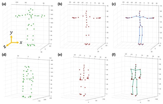 (a) The details of the markers (c3d file), (b) AMC file, and (c) the skeleton (ASF file) of the HDM05 MoCap dataset [9], while (d–f) elaborate on the details of the marker (c3d file), the AMC file and the skeleton (ASF file) of the CMU MoCap dataset [56], respectively.