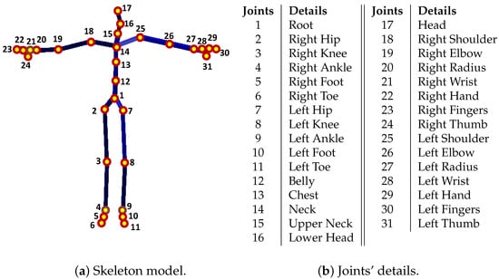 - In the first case, we deal with the recovery of missing joints [48]. The skeleton model, in this protocol, consists of 31 joints, and the details of the joints are described in Figure 3. In contrast, the details about Acclaim Motion Capture (AMC) file and the Acclaim Skeleton File (ASF) are shown in Figure 2b,c, respectively, for the HDM05 MoCap dataset [9], and for the CMU MoCap dataset [56], the AMC and the ASF files are shown in Figure 2e,f;
