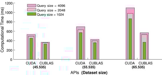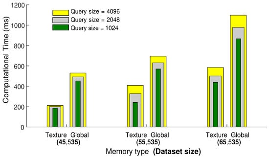 The results reported in Figure 5 demonstrate that texture memory is fast and efficient compared to global memory, but unfortunately, when we increase the size of the query or dataset, the texture memory goes out of bounds, and the proposed framework halts. There is a trade-off between memory capacity and time complexity. Since we deal with huge and high-dimensional datasets, global memory with large and shared memory capacity is a suitable option for further experiments.