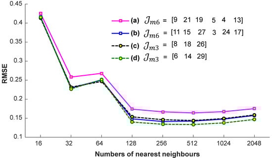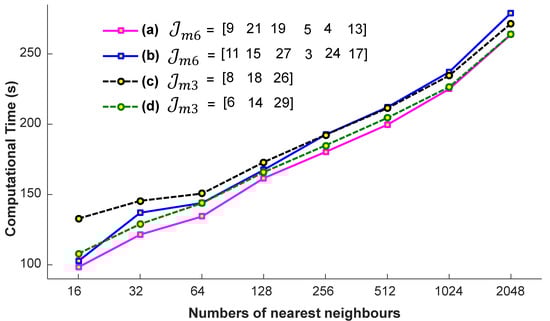 We conduct a few preparatory experiments to fix the number of nearest neighbors, denoted as . We evaluate the efficiency of the proposed system on the account of nearest neighbors, when the input query sequences are with a different missing joint set, with and , i.e., , , , and . These missing joints are selected randomly. For these experiments, the values engaged for are 32, 64, 128, 256, and 512. We conclude from the results reported in Figure 7 that we achieve almost the best results at a particular number of the nearest neighbors, i.e., . If we increase the number of nearest neighbors, the accuracy remains nearly the same. We also see the impact of -nearest neighbors in terms of computational time. From the results presented in Figure 8, it is quite obvious that the time increases linearly with the increase in the number of nearest neighbors. Generally, the selection of the suitable number of nearest neighbors is a trade-off between the accuracy and the computational time. There is no doubt that, if there is a smaller number of nearest neighbors, the system will be faster, but we have to compromise the accuracy then. In short, in this paper, the best suitable value for is 256, and we fix this value for the rest of the paper, independent of the datasets.