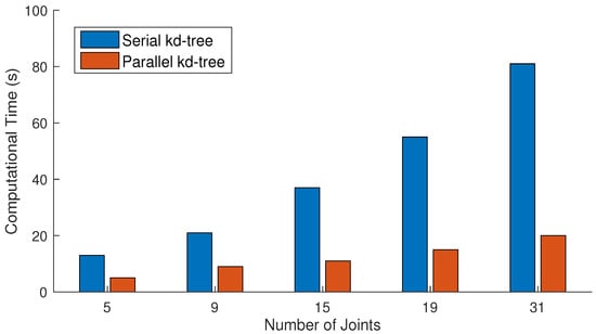 Comparative analysis of serial and parallel construction of kd-tree when the sizes of dataset and query are 65,535 and 2048, respectively. The number of nearest neighbors is fixed to 64 for these experiments.