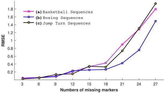 In this experiment, we evaluate our proposed approach with a different number of missing joints m, i.e., 3, 6, 9, 12, 15, 18, 21, 24, and 27. We conduct this experiment on three motion categories: basketball, jump turn, and boxing. The results shown in Figure 14 elaborate that, as expected, the error increases with the increase in the number of missing joints. The highest error is found when the input query poses have 27 missing joints. The results show that, when the number of missing joints cross some specific value, i.e., 18, the RMSE increases exponentially for all three motion categories. We may conclude from this experiment that our proposed approach is reasonably able to endure up to 14–18 missing joints.