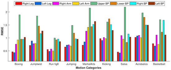 In the second experiment, instead of selecting missing joints randomly, we drop out all the joints of some specific body parts. We test our approach when all the markers of the following body parts are dropped out: right leg, left leg, right arm, left arm, upper body part, lower body part, right body part, and left body part. We perform this experiment on various motion classes such as boxing, jumptwist, run fig8, jumping, martial arts, kicking, salsa, acrobats, basketball, etc. We observe from the results shown in Figure 15 that RMSE is at its peak when the upper body part is missing. This is because, for most of the motions, the upper body joints contribute significantly to performing actions compared to the other body joints. However, in a few motion categories such as run fig8 and kicking, RMSE with missing upper body parts is less than different motion categories such as boxing, jumptwist, martial arts, etc., because the upper body joints do not contribute as much to the motion classes as mentioned earlier. Conclusively, RMSE increases if the joints of the most contributing body parts in performing some particular motion are missing.