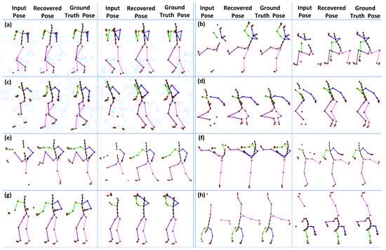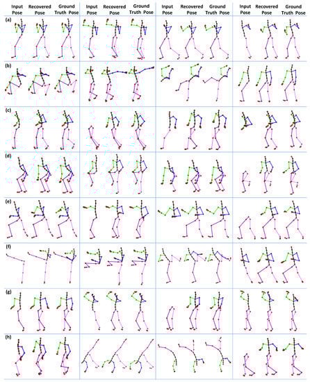 The 3D recovery results for different motion categories, when the number of missing joints is . (a) Boxing; (b) Jumptwist; (c) Run fig8; (d) Jumping; (e) Martial Arts; (f) Kicking; (g) Salsa; (h) Acrobat.
