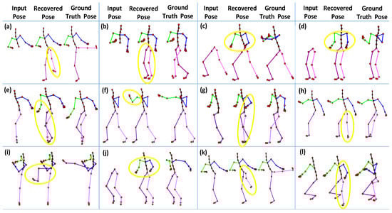 A few worst or failure cases of 3D recovery when all the joints of a whole body part are missing. (a) Kicking (all the joints of the lower body part are missing); (b) Acrobat (lower body part); (c) Martial arts (upper body part); (d) Salsa (upper body part); (e) Basketball (right body part); (f) Boxing (right arm); (g) Run fig8 (left body part); (h) Jumptwist (left leg); (i) Kicking (right leg); (j) Jumping (upper body part); (k) Kicking (left leg); (l) Martial arts (right body part). The yellow circles point towards the incorrect recovery of missing joints.