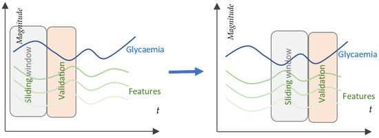 The sliding window operates as described. Every time a new CGM value is received, the training dataset is restructured by deleting the oldest observation, shifting all values up by one place and then inserting the newly arrived value as the newest value. Consequently, the size of the dataset and order of the observations are always maintained.