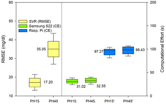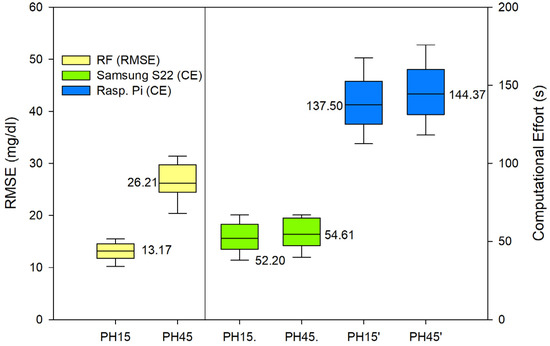 The RF computational effort on a Raspberry Pi was at the limit of what was acceptable, having average times that fell within the tolerable range considering that the sampling frequency is 5 min. However, if we want to ensure that the device will be able to make a prediction before the next data arrives, we should either run SVR or RF, but the latter should be limited to running on the Samsung S22.
