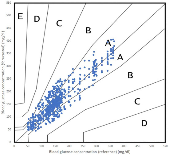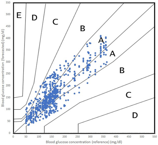 - Zone E: This zone represents the most inaccurate and dangerous predictions, where the predicted values are entirely opposite to the reference values. Predictions in this zone would lead to severe treatment errors that could have life-threatening consequences for the patient.