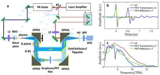 The air-plasma-based THz-TDS setup is shown in Figure 1. To obtain high THz field strengths, laser pulses centered at a wavelength of 1.4 µm and 40 fs duration from a high-energy optical parametric amplifier (HE-TOPAS) pumped by a Ti: sapphire amplifier laser system (SpectraPhysics Spitfire Ace, 0.8 µm wavelength, 6 mJ pulse energy, 35 fs pulse duration, 1 kHz repetition rate) was used as the driving laser source [21]. A 100 µm thick BBO crystal was inserted for inline second harmonic (SH) generation after a lens with a 300 mm focal length. A dual-wavelength wave plate aligned the polarizations of the residual fundamental wavelength pulses and the SH wavelength pulses, ensuring efficient broadband THz wave emission with linear polarization. A small portion of the output directly from the laser amplifier was employed as the optical probe beam for the THz waveform detection. An 8 mm diameter hole in the center of the first off-axis parabolic mirror (OPM1, 4” effective focal length) eliminated most of the residual laser beam while reflecting most of the THz beam at the same time due to the conical emission pattern of the air-plasma THz wave emission [22,23]. Three off-axis parabolic mirrors (OPM2-4, all with 3” effective focal length) were employed to generate an intermediate focus on the sample, as well as the final focus at the high voltage (HV) electrodes (OPM3 was skipped for the R-mode configuration). A 20 THz long-pass filter (QMC Instruments) removed the residual pump laser light from the THz beam path. A 2 mm thick high-resistivity silicon plate was inserted into the collimated THz beam path before the sample at 45°, which picked up the reflection signal from the graphene/PET sample. Another 45° metallic reflector on a flip mount redirected the reflection signal into the air-biased-coherent-detection (ABCD) [24]. When the metallic reflector is flipped down, the setup is switched into standard T-mode measurements, with the exact same sample position as the R-mode measurement. Multiple (up to 10) high-resistivity silicon wafers with minimal dispersion and absorption in broadband THz frequency range were used to adjust the incident THz pulse field strength onto the graphene sample [25] according to the attenuation formula , where N is the number of wafers inserted in the beam. With zero attenuation wafers, the THz pulse energy was 0.51 µJ at the sample location, and the calculated peak THz electrical field strength was 1050 kV/cm, based on measurement of the beam profile and the time trace detected by ABCD [23]. The incident THz field can be reduced with the insertion of wafers to a minimum of 30 kV/cm with 10 wafers inserted. The setup was purged with pure nitrogen to avoid the influence of water vapor absorption.