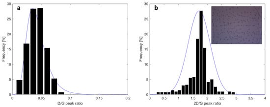 (a) The Raman histogram of the ratio of D band to G band intensity. (b) The Raman histogram of the ratio of the 2D band to G band intensity. Inset, an optical image of the graphene.