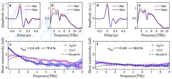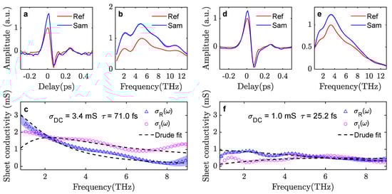 The red curve (Ref) in Figure 5a represents the measured reflected waveform from the PET, and the blue (Sam) is the reflection from graphene/PET. Due to the existence of free carriers in the graphene sheet, the sample signal is significantly higher in amplitude. The as-measured reference and sample waveforms show an artificially large time delay (phase offset). For optimum Drude model fitting, a time delay = 149 fs has already been numerically subtracted in Figure 5a. With this phase correction, the complex graphene conductance spectrum is extracted together with the optimum Drude model fitting curves at a broad frequency range (1.5–9 THz), as shown in Figure 5d. There is good agreement between the measured data and the fit, and the squared norm of the residual from the fit represents the minimum when fine-tuning the phase slope for optimum phase offset correction. The calculated phase difference and reflection curves, together with the calculated value from the Drude fit parameters, are shown to be in good agreement in Figure 5b,c. To demonstrate the precision of the phase correction procedure, Figure 5e–h shows the results when only 2 fs of extra shift is introduced to the optimum correction case. The calculated graphene conductance spectrum leads to a significantly worse Drude fit, with the fitting , which is 2.5 times higher compared to the optimum case. Deviations between the calculated and fitted reflection and phase difference curves are clearly visible. Figure 5i–l shows the situation of 4 fs of extra time delay shift, and it is evident that the extracted graphene electrical properties are now clearly non-Drude in the 1.5–9 THz range. It is worth noting that the ultra-broad bandwidth available in this study is essential for the very fine delay/phase correction; the uncertainty from the described correction procedure will be greatly compromised with a narrower spectral bandwidth.
