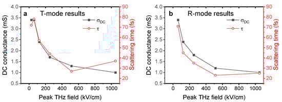 (a) DC conductance and scattering time obtained from Drude fits at various incident peak THz field strengths from the transmission-mode THz-TDS measurements. Solid squares: DC conductance. Open circles: scattering time. (b) The same parameters extracted from Drude fits reflection-mode measurements.