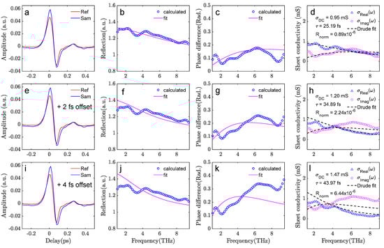 Phase offset correction of the reflection-mode THz-TDS data analysis. (a–d) With optimum offset correction, the extracted conductance spectra match the best with the Drude model. The calculated reflection and phase difference curves also match best with the fit. (e–h) With 2 fs extra phase offset, the extracted parameters show significant deviation from the Drude model fits. (i–l) With 4 fs extra offset, a Drude fit is impossible in the broad frequency range.
