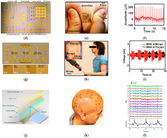 Another strategy for skin-to-device contact is the application of pressure sensitive adhesives (PSA), which are the viscous substrate that achieve conformal contact by electrostatic forces. Similar to van der Waals forces in essence, electrostatic interactions are attractive or repulsive forces between two surfaces caused by the opposite or the same charges [107]. The difference between them is that electrostatic force has a larger value and a longer dominant distance of a few micrometers [108,109]. It is worth mentioning that even when SPA tape is able to hold two surfaces together by electrostatic forces, van der Waals forces are still involved when two subjects are close enough. If the applied pressure is inadequate, the bonding faults, such as bubbles or detachment, may exist and affect adhesion [110]. Adhesion and flexibility contribute to PSA for wearable devices to form conformal contact even under large strain. In 2014, the skin-wearable ECG patch was made of mixing CNT with adhesive polydimethylsiloxane (aPDMS) as the adhesion layer for Au/Ti/polyimide FS to form a triangle structure with three leads and to provide ECG signals from three directions [49]. An adhesive force of 1.1 ensures the firm skin attachment with an impedance of 241 kΩ at 40 Hz. The device obtained comparable results to the commercial Ag/AgCl electrodes when attached to the subject’s chest. PSA layers enable large-area multi-channel devices for biopotential detection (Figure 2j–l) [50]. In this study, adhesive silicone was used as the interface between the skin and the device. The micropores in the adhesive silicone provide a highly breathable interface, which is the result of micropores poly (methyl methacrylate) (PMMA) that is embedded before curing and removed after curing by acetone. The device can measure reinnervated muscle movements simultaneously in eight channels when mounted on the amputated upper limb. Clear signals for ECG and EEG are obtained by using standard digital filtering techniques. Conformal electronics can further monitor these signals during functional magnetic resonance imaging (fMRI) and provide additional information on physical and psychological states [111]. Another way to enhance the adhesion force is to use an auxiliary bilayer consisting of a ferromagnetic layer and adhesive silicone with conductive FS traces [51]. The obtained device with an SNR of 8.2–13 is suitable for clinical applications, such as ECG, EEG, and EMG. In addition, conductive materials can also be mixed with structural materials to form the PSA layer directly. Using poly(ethylenedioxythiophene):poly(styrenesulfonate) (PEDOT:PSS) mixed with waterborne polyurethane (WPU) and D-sorbitol, the stretchable electronic with an adhesive force of 0.4 and a low impedance of 82 at 10 Hz was formed [2]. The device can be attached to the skin to detect the clear signals of ECG, EMG, and EEG.