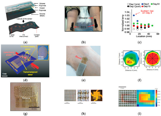 where is the resistance at the reference temperature (usually ), and A and B are the coefficients that depend on the different metals applied. The metals used most often are platinum (Pt), nickel (Ni), and copper (Cu). Cu has been built into a resistance thermal sensor to monitor wound healing by utilizing a 3-um-thick fractal layout designed in six sensing elements for an epidermis electronics system (EES) (Figure 3a–c) [52]. Having six sensors provides accessibility for spatial records of temperature and thermal conductivity. Polyimide layers and Cu traces minimize the bending strains. The encapsulated traces are transferred to a silicone membrane to realize a waterproof device. The results show that the electrical resistance change is capable of temperature measurement with a precision of ~50 mK in lab and ~200 mK in clinical testing. The device was laminated on a cutaneous wound from day 1 to day 30 after surgery to monitor the temperature change in the skin surface of the forearm. The inflammatory phase of wound healing can be detected when the thermal conductivity changes on day 3. Similar resistance-based metal filamentary serpentine designs also use Pt and Au as the sensing array for temperature sensing, with performances comparable to that of an infrared camera [4,36]. Human skin exhibits large variations in thermal properties. A Au coil geometry device has been reported to measure temperature up to 6 mm beneath the skin surface by finite element analysis (FEA) [53]. NiO has been used for body temperature sensing due to its relatively large negative temperature coefficient (NTC), which exhibits a simple structure and high temperature sensitivity [54]. In the study, the NiO metallic nanoparticles coated layer was irradiated with a laser to fabricate Ni-NiO-Ni structures with tens-of-micrometer-wide NiO channels. The final device presents a response time of 50 ms, which could be attributed to the 25 -thin PET substrate. The respiration temperature during exercise can be detected when the device is attached to the front of the nasal cavity. In addition, a metal and metal oxide, PEDOT:PSS, has also been used for temperature sensing by applying pre-strain to PDMS substrates [55].