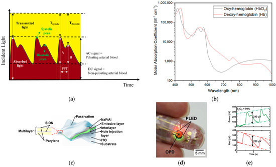 Images of photoelectrical signal measurement for skin-wearable devices. (a) The model for the pulse oximeter’s light transmission path. (b) Molar extinction coefficient for hemoglobin in water. (c) Schematic of polymer LED with passivation layer composed by organic parylene layers and inorganic SiON layers. (d) The soft pulse oximeter taped on fingertip. (e) The output green (top) and red (bottom) PPG signals with 99% oxygenation of blood. (Reprinted/adapted from reference [59]).