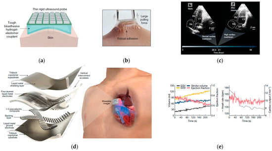 The second approach is to fabricate a stretchable ultrasound probe to be worn on the skin. The stretchable ultrasound device can be built with metal traces, using electrodes and piezoelectric 1–3 composite as transducer materials [174]. In addition, the wearable ultrasound imager with high stretchability of up to approximately 110% has also been built to detect the critical cardiac features (Figure 6d-e) [71]. The device was built by utilizing liquid metal as the electrodes, triblock copolymer (styrene–ethylene–butylene–styrene (SEBS)) as the substrate, and 1–3 piezoelectric composite (PZT-5H) as the ultrasound transducer. The center resonant frequency of the device is 3 MHz and the penetration is greater than 16 cm. The device can also detect cardiac activities before, during, and after exercise. A deep learning model was applied to extract information, such as stroke volume, cardiac output, and ejection fraction, from sequential images.