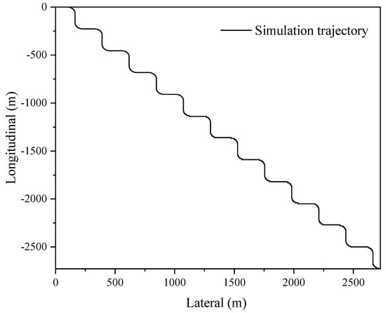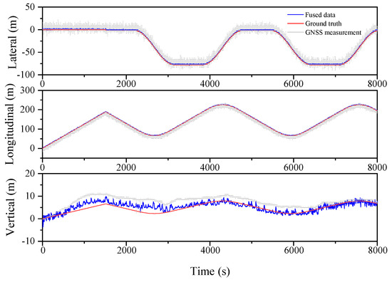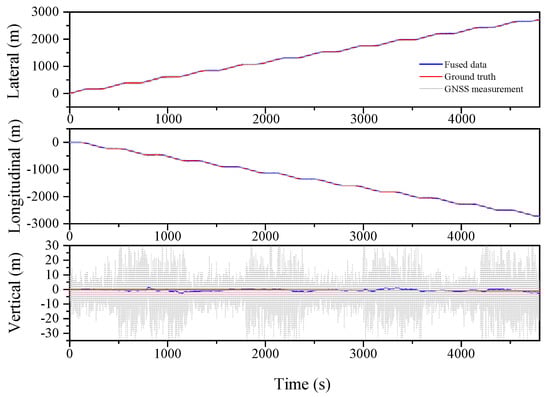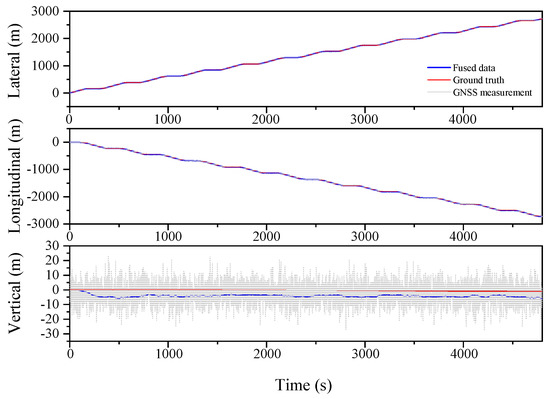 The proposed sensor fusion algorithm is demonstrated in a relatively open environment, which allows for uninterrupted satellite signal and individualized GNSS localization. The acquisition frequency for GNSS data is 1 Hz, while the IMU data are acquired at a frequency of 100 Hz; the smooth dimension is selected as 10. These parameters provide acceptable conditions for analyzing the accuracy of combined GNSS/IMU localization, even in the event of GNSS signal loss, as demonstrated by the trajectory shown in Figure 2. In order to evaluate the localization accuracy of the GNSS/IMU combined localization process, the simulation involves artificially inducing the loss of lock by introducing exaggerated errors to the GNSS satellite observation information based on raw GNSS data.
