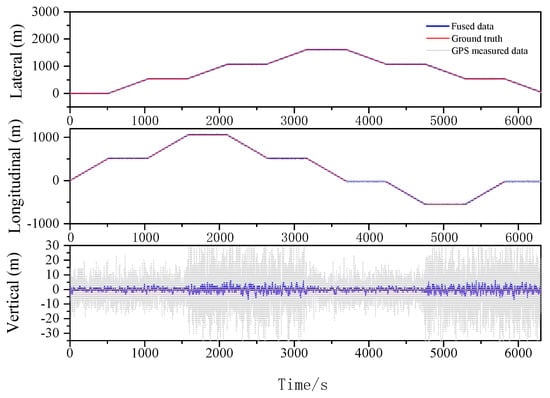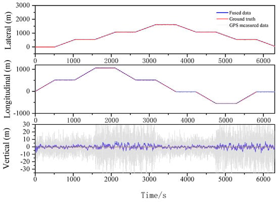 The localization results for the various filtering algorithms are shown in Figure 3, Figure 4 and Figure 5 and Table 2. It can be seen that the ESKF algorithm exhibits better target tracking accuracy compared to the EKF algorithm, as evidenced by its RMS values of 1.633 m, 1.782 m, and 1.476 m for Lateral, Longitudinal, and Vertical directions, respectively. By reducing the error state parameter, the accuracy of the three poses is improved by 2.8%, 2.1%, and 52.0%, respectively. After performing the backward smoothing filtering process, the RMS values of the three attitudes are further optimized to 1.463 m, 1.588 m, and 1.393 m, respectively. Moreover, the target tracking accuracy of ESKF–RTS is superior to ESKF, with the attitude accuracy in the three directions improving by 10.4%, 10.9%, and 5.6%, respectively. The trajectory also reveals that the curve of ESKF–RTS is smoother, further highlighting the advantages of ESKF–RTS over the other two algorithms in addressing the problem of smooth estimation of nonlinear states.