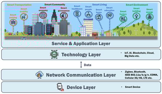 As depicted in Figure 1, smart cities can be divided into four layers. In the top layer, there is the provision of services and applications for residents living in the smart cities. Below this, there are the technology, network communication, and device layers.