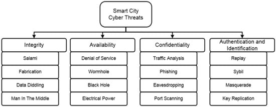 Several studies have been conducted on the cybersecurity challenges in smart cities. For example, Kalinin et al. [] classified common cyber threats to smart city infrastructure, as depicted in Figure 2. AlDairi et al. [] conducted a literature review of security and privacy issues in smart cities and proposed solutions to address them. Neshenko [] designed a method to detect smart city industrial control system (ICS) attacks by investigating unnoticed changes in network traffic patterns and using interactive visualization to filter out false alarms. Alassad et al. [] proposed a model to prevent damage from cyberattacks originating from online social networks using focal structure analysis (FSA) and deviant cyber flash mob detection (DCFM). Hamid and Bawany [] presented a security framework called ACIDS, which identifies potential security threats in the five layers of smart city systems and helps to develop security measures in different fields.