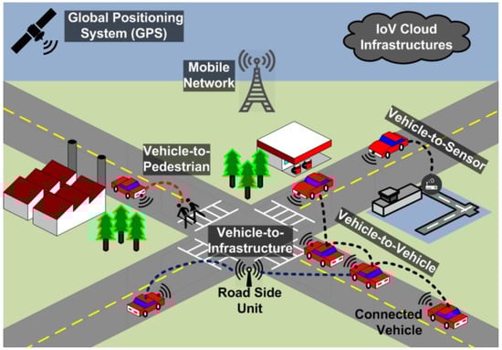 Javed et al. [] conducted a security study on next-generation intelligent transport system (ITS) applications in smart cities, as shown in Figure 3. After analysing the security architecture of the European Telecommunications Standards Institute (ETSI) ITS standard, they implemented ECC-based digital signatures and encryption procedures using experimental test beds. In their study, a network simulation model was used to reproduce the smart city scenario. From the experimental results, they found that existing security solutions could directly affect the quality of service and safety perception of vehicle applications. Wang et al. [] provided strategies to protect connected vehicles and the AI in the vehicles and also discussed automobile cybersecurity attacks. Kim et al. [] discussed the implications of attacks on autonomous vehicles and how to defend against such attacks when integrated with the AI within the main components of smart cities, based on a systemic survey.