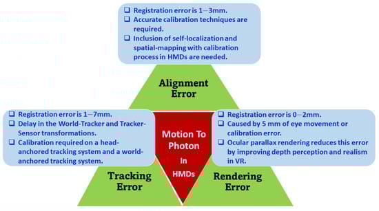 There are several factors responsible for the association of delays with the simulation environment and the AR/VR devices while presenting an enhanced view of the surroundings to the users in the virtual world. The low end-to-end delay in AR/VR devices arises due to the steps involved in sensor sampling, data processing and fusion, image rendering and encoding, transmission and decoding, and displaying of each frame. These are some of the main causes for the occurrence of the motion-to-photon (MTP) latency, as shown in Figure 1. Therefore, innovative network designs, technologies, methods, and devices must be considered to improve the traditional AR/VR systems by providing an immersive seamless VR experience with extremely low end-to-end latency. However, it is required to keep the MTP latency under as the VR cloud services are extremely sensitive to low latency, which may cause dizziness for the users. It is challenging to maintain a low MTP latency as VR terminals have to undergo a serial process of motion capture, logic computing, picture rendering, and screen display. Hence, despite the extensive advances in AR/VR technologies, MTP latency [] acts as the greatest barrier by holding back AR/VR adoption from proving a fully immersive experience and offers limitations in the field of view due to occlusion, as well as poor display quality. A very minimal MTP latency of less than for head-mounted display (HMD) users is required to avoid having an unrealistic experience of the virtual world []. It has been proven [] that a latency of or less for both AR and VR should be experienced to have a decent effect on users without causing any motion sickness. When the data from the HMDs fail to register spatially and temporally with the user’s view of the surroundings, an effect called misregistration occurs. This phenomenon is a result of a mismatch in measuring the time consistency in tracking data displayed on the HMD considering the location and orientation of the controllers []. Figure 1 presents a brief description of the various types of errors arising from MTP latency in AR/VR devices. Three types of major errors, namely alignment, tracking, and rendering error, arising from MTP in HMDs along with their quantity and the technique needed to mitigate these errors are mentioned in this figure. Some hardware devices, such as optical see-through (OST) virtual headsets and simulator systems, are commonly used to translate the virtual content into the real world. However, they can also be affected by latency in the form of misregistration. Several techniques, such as time warping [] or post-render warping [], have been proven to improve the average quality, as well as the consistency of latency on both the display and the rendering engine.