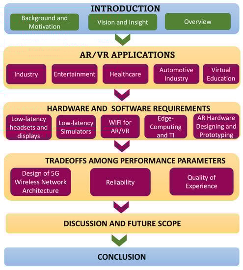 The remainder of this paper is organized as follows. In Section 2, we discuss the AR/VR applications in different verticals. In Section 3, we explore the requirements for ultra-low latency from the AR/VR software and hardware perspectives. In Section 4, we present the various trade-offs associated with the performance parameters to ensure a reliable and low-latency communication. In Section 5, we provide a brief discussion on the challenges and the possible directions for future research. Finally, in Section 6, we conclude the paper. Figure 2 depicts the organization and overview of the paper. The acronyms used in the paper are listed in Table 1 along with their respective definitions.
