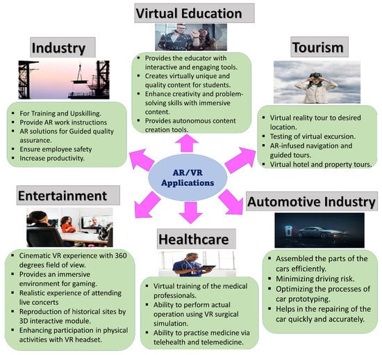 AR and VR provide maximum benefit in the entertainment industry with their applications based on improving the gaming experience and enhancing cinema, events, shows, and museums, hence attracting more customers. The gaming industry is investing a massive amount to deploy virtual environments in entertainment as the gaming market size is expected to grow at a compound annual growth rate of % from 2020 to 2027, as provided by Grand View Research []. The use of VR and AR creates an immersive environment for the gaming audience. We can consider the example of VR gaming in Ace Combat 7, where the game utilizes detailed aircraft and photorealistic scenery to provide a realistic simulation experience to the players as if they were really flying in a fighter jet []. AR/VR provides the realistic experience of attending live concerts while saving time by building an audience with the help of the Metaverse []. Artists can develop a three-dimensional virtual environment to showcase their work or ideas to the audience. The audience can experience nostalgic and insightful histories and culture without visiting a museum with the 3D interactive modules and the VR space provided by the AR/VR technologies [].