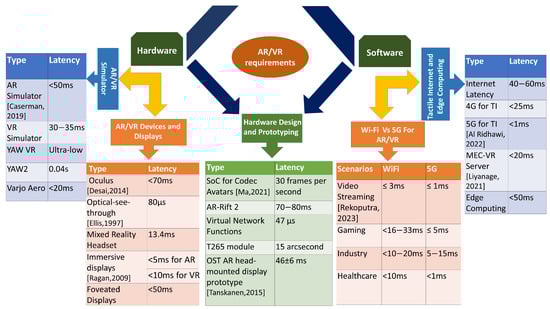 This figure details the requirements for various types of latencies associated with AR/VR technologies from the hardware, software, and design perspectives in order to enable a low-latency connection in an immersive environment.