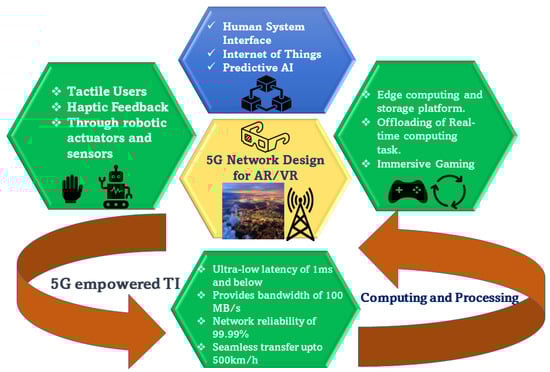 The TI is an innovative tool used for AR/VR applications comprising sensors, actuators, robotics, computation components, and dedicated hardware (e.g., wearable devices) to empower tactile and haptic (e.g., touch, visual, and auditory) feedback in Internet-based applications []. The TI is assumed to be the next evolutionary phase of the Internet of Things (IoT) utilizing machine-to-machine (M2M) and human-to-machine (H2M) interactions to incorporate a wide range of application scenarios in the industrial, eHealthcare, education, and entertainment sectors. With the usage of 5G communications, the TI has turned into an evolutionary technology for the IoT and Society 5.0 by providing delay mitigation and enabling real-time interaction with haptic data over the Internet to address complex issues in our current society []. Three different layers of the TI, namely the master, network, and slave layers, should be analyzed carefully while integrating 5G with the TI for ultra-reliable low-latency applications. The master layer has an important role in the conversion of the human input or haptic feedback (from a communication perspective) into tactile data by using a human–system integration present at the layer. Then, the HSI transmits the tactile data created by suitable tactile encoding techniques over the controlled domain via the network layer. The controlled domain provides all the haptic feedback signals including audio/visual feedback signals to the master layer connected over the network domain via a two-way communication link. With its integration with 5G, low-latency communication is achieved by incurring a round-trip time (RTT) of less than , which will support haptic communication [].