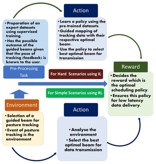 - For hard scenarios, we can apply the combination of reinforcement learning and supervised learning, known as imitation learning (IL) [], to tackle the rapid loss of the buffer packets as a result of frequent multi-modal interactions in such scenarios. This includes a preprocessing step, which involves generating an expert dataset through supervised training based on the possible outcome of the guided beams given that the pose of tracking (feedback) is known to the user. The action is based on learning a policy through behavior cloning [] by mapping the multi-sensory information with the respective optimal beam based on the pre-trained dataset. The reward is then determined from the action to select the best scheduling policy for a low-latency data delivery. Hence, the goal of achieving the trade-off between beam alignment and data transmission in such scenarios for low-latency communication in AR/VR is made possible by IL.