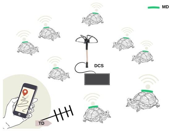 Schematic diagram showing the family of interacting devices: the monitoring device on individuals (MD), the data collector station (DCS), and the tracking device (TD).