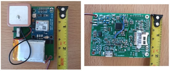 The PCB with components for MD applications has dimensions of 48.7 mm × 63.7 mm and is 1.6 mm thick, and its weight is estimated at 9.2 g. The total weight of the PCB including battery and GNSS receiver, as shown in Figure 2 is 44.9 g, which represents approximately the 2.7% of the weight of a 1.5 kg tortoise.