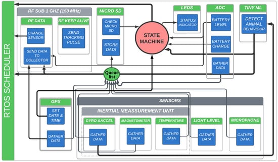 The OS tasks interact with each other and with the FSM, as shown schematically in Figure 4. The FMS is in charge of processing the events and checks the state of the device. Based on the state, it orders the RTOS to carry out the corresponding actions, such as pausing sensors tasks to allow the system to go into sleep mode, and deleting or creating a new sensor task with a different configuration based on animal activity levels. All sensors gather data until their own buffer reaches a configurable level. When this happens, the task asks for permission to store the buffer content on the micro SD memory card, which is a shared resource among the OS tasks.