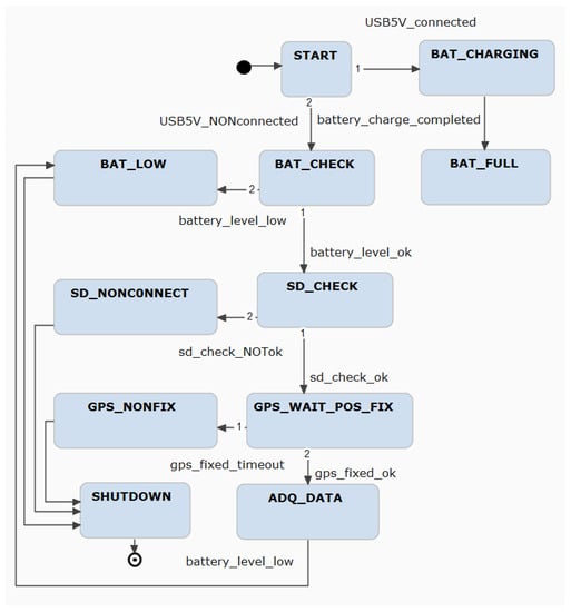 While the interaction between different elements of the system is mainly managed by the RTOS, the global scenario is controlled by a finite state machine (FSM). This FSM is responsible for the operation mode selection and controls the access to the micro SD memory card. The device has three modes of operation: charging, checking, and operational. Charging mode is entered when the device is connected to an USB port to charge its battery. In this mode, the MCU only monitors charging voltage and current. This information is useful to track battery behavior and determine its lifespan. Checking mode is the first state after powering on, when not connected to an USB port. While in this mode, the MCU checks for battery state, presence of micro SD memory card and every configured sensor, and waits until the GNSS receiver obtains a fix. In case any sensor check fails, an alert is indicated by LED flashing. While waiting for the GNSS receiver fix, another LED flashes. This device check, before attaching it to the animal in the field, allows ensuring the proper acquisition of the data over several days. Once all operational conditions are met, the device starts to gather data from all sensors according to each configuration, and stores it in the micro SD memory card. A subset of this data is periodically sent to the DCS over the RF link.