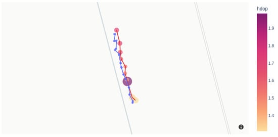 However, the radii of the circles around the MD coordinate (shown in yellow to red in Figure 5) are proportional to the horizontal dilution of precision (hdop), which is an estimation of the GNSS measurement accuracy in latitude and longitude. This accuracy depends on the exact positions of the (usually four) satellites, relative to the GNSS receiver. For instance, a low hdop value represents better positional precision, and a value of hdop between one and two is considered accurate enough for most sensitive applications. These values are comparable to those reported in animal-tracking studies using GPS tracking technologies [], although it is highly dependent on the geographical place where measurements were performed.