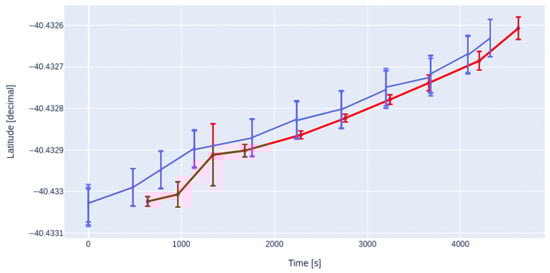 Latitude measured with a handheld Garmin GPS (blue) overlapped with the same positions measured with the MD (red), at the same positions plotted in Figure 5. The error bars represent the measurement errors as explained in the text for each methodology.