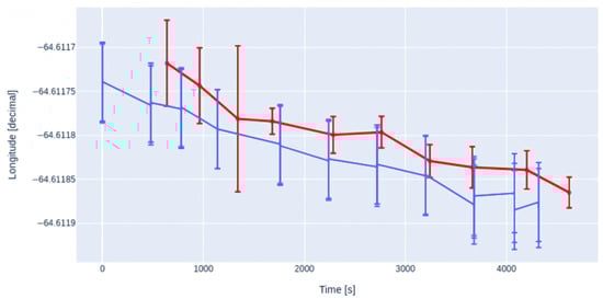 Longitude measured with a handheld Garmin GPS (blue) overlapped with the same positions measured with the GPS of the MD (red), at the same positions plotted in Figure 5. The error bars represent the measurement errors as explained in the text for each methodology.