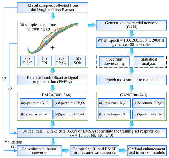 In this study, the hyperspectral prediction and data augmentation of soil TK2O, TN, TP2O5, and SOM contents in the Yellow River source area of the QTP with small samples were investigated using Vis–NIR and GAN techniques. First, the collected soil spectral data and nutrient data were simultaneously augmented by GAN and EMSA, and the GAN-generated data were evaluated based on several aspects to determine the best data. Then, different amounts of data generated by GAN and EMSA were added to the real data to train the CNN, and the accuracy of the CNN on the same validation set was compared. The augmentation effects for the four nutrients and the range of suitable quantities were analyzed to build a hyperspectral prediction model for soil nutrients. The detailed technical method is shown in Figure 1.