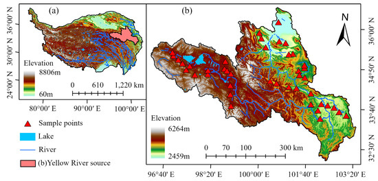 Qinghai–Tibet Plateau (a), the source region of the Yellow River, and the locations of sampling points (b).