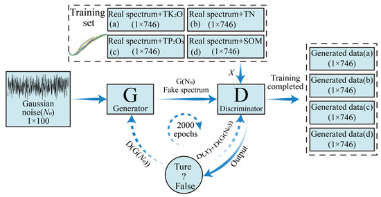In this study, we needed to train the spectral and nutrient data from the four soil nutrients, i.e., the four matrices P1, P2, P3, and P4 in 3 were input into the designed GAN for training. The specific principle is shown in Figure 3. The epoch was set to 2000; the learning rate was 0.0002; the optimizer for both G and D was Adam [57]; sigmoid was used as the activation function, and the mean squared error loss was the loss function.