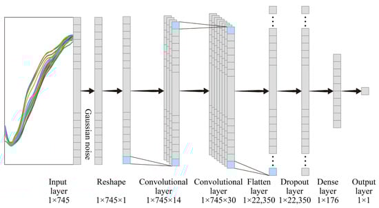 The CNN architecture usually consists of an input layer, n hidden layers (convolution layers, pooling, and fully connected), and an output layer. Among the CNNs, 1D-CNN has an input layer and 1D filters on the convolution layers suitable for one-dimensional spectral data. In this study, the spectral data were first fed into a Gaussian noise layer with a 0.01 standard deviation, which was used to improve the generalization ability and robustness of the model. This was followed by two one-dimensional convolutional layers with ReLU activation functions. Next, the output of the convolution kernel was flattened using a Flatten layer, and a pooling layer (rate = 0.045) was added to prevent overfitting. Finally, a dense layer and a single dense neuron with a linear activation function were used as the output layers, resulting in a one-dimensional vector. The loss function was a Huber loss [41] adapted for Keras, the optimizer was the Adadelta optimizer, and epoch = 800. The structure of the CNN is shown in Figure 4.