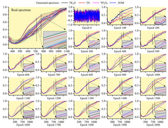Figure 5 shows the real spectral curve of soil and the spectral curve of GAN generation of four nutrients at different epochs. Because of the large area sampled, the nature of the soil samples varied, resulting in differences in the original soil spectra. Therefore, real spectra were used for reference, rather than the mean of several. In addition, because the number of generated data points was too large for a complete presentation, a GAN spectrum was randomly selected at each epoch to be analyzed. Finally, each epoch corresponded to a graph with four curves corresponding to each of the four nutrients (see Figures S2 (TK2O), S3 (TN), S4 (TP2O5), and S5 (SOM) in the Supplementary Materials for complete data plotting for each nutrient). As shown in Figure 5, the data generated at epoch = 0 was random noise, while the GAN-generated data at epoch = 100 had the shape of real data to some extent, but with a large amount of noise. When the epoch was 200, 300, 400, and 500, there was more noise in the data, but they were improved compared to 100. Further analysis of 600–1000 showed that the GAN-generated spectral data were very similar to the real spectrum’s shape and were relatively smooth. However, the local magnification revealed that there were still small burrs, which was somewhat different from the real spectra. When epoch ≥1000, the shape of the fake spectrum was almost identical to the real data and the overall and local details were smoother, especially after epoch = 1300. Therefore, GAN spectra for constructing predictive models can only be selected after epoch = 1200. However, it should be noted that although the spectra generated after epoch = 1200 looked very similar to the real spectra, further analysis of the similarity and diversity between the fake and real spectra is needed to determine whether they can act as real data.