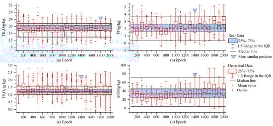 In this section, boxplot and commonly used statistical indicators were used to analyze the GAN-generated TK2O, TN, TP2O5, and SOM data separately, and compare them with the real data (see Figure S7 in the Supplementary Materials for the statistical comparison results of EMSA). Boxplots were first used to reflect the distribution of each nutrient at different epochs and were overlaid with the real data, and the results are shown in Figure 7.
