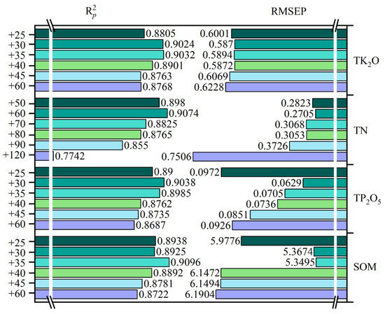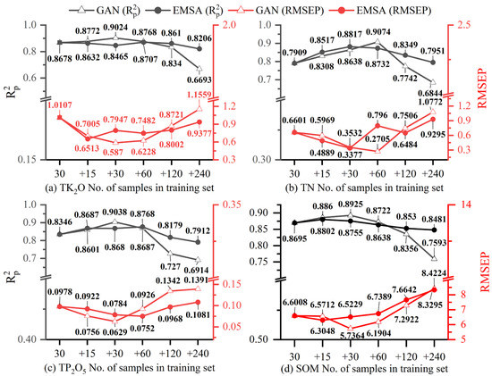 - Based on the previous conclusion to reduce the interval of augmented data, the reasonable ranges for adding GAN data to real TK2O, TN, TP2O5, and SOM data were 30–40, 50–60, 30–35, and 25–35, respectively. The accuracy changes of the TK2O, TN, TP2O5, and SOM prediction models are as follows: the of the validation set increased by 4.08%, 14.73%, 8.29%, and 4.61%, and the RMSEP decreased by 41.68%, 59.02%, 35.69%, and 18.96%, respectively.