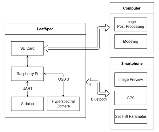 An Android smartphone previews the HS images taken by the LeafSpec device and allows the user to input the metadata of the current HS images. The smartphone connects to the LeafSpec device using Bluetooth. Figure 4 shows how the data flows between different components of the LeafSpec system.