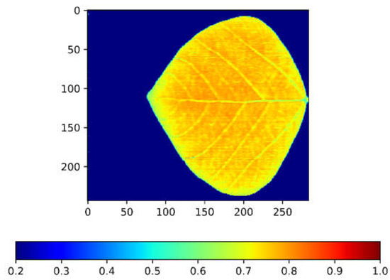 After the HS images were calibrated using white reference, the leaf pixels were segmented using the NDVI heatmap. The heatmap was calculated by applying the NDVI equation, Equation (2), to each spectrum in the HS images. The leaf could then be segmented using an NDVI threshold of 0.4.